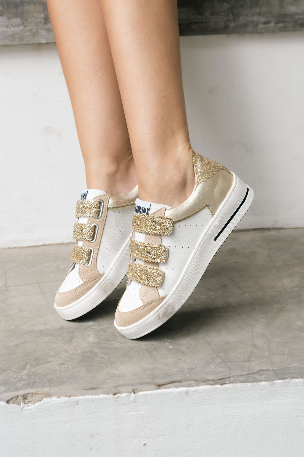 The Garen 10430 redefines statement footwear. This low-top sneaker commands attention with three glitter-encrusted straps, metallic gold heel, and a white leather upper with sand suede trims. Clean lines meet loud sparkle — for the ones who don’t play it safe.