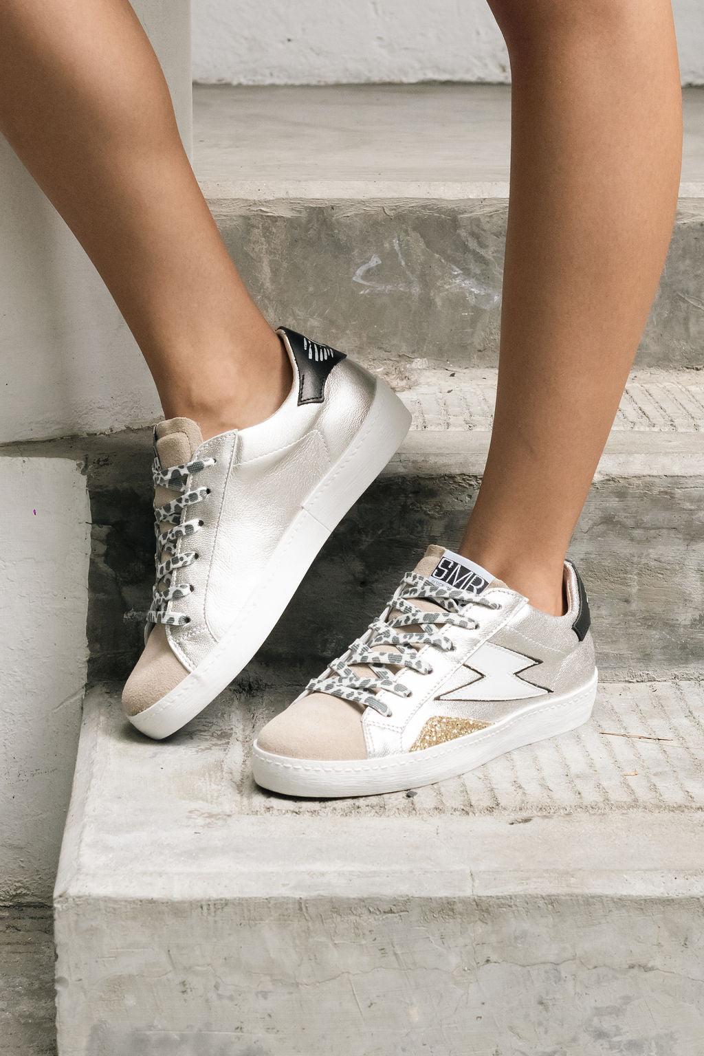 Larry A343 brings a flashy twist to a classic silhouette with metallic silver leather and gold glitter accents. Features a white suede toe cap, leopard print laces, and a bold white lightning bolt on the side. Finished with a black leather heel patch for added contrast.