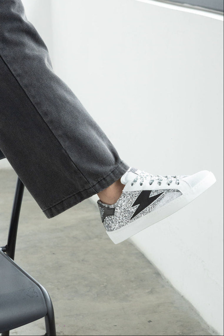 Step into eye-catching style with Larry A345. Featuring a sparkling silver glitter upper contrasted by a sleek black leather lightning bolt and heel patch. The light grey suede toe cap and matching leopard print laces add a cool edge. Finished with a clean white sole for a crisp look.